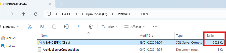La base de données porte le nom AISANCEDBX_CE.sdf se trouve dans le repertoire C:\PRIVATE\Data