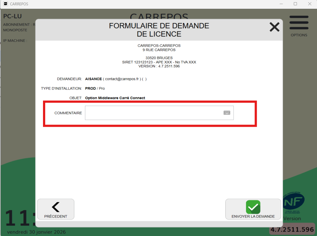 Demande l’intégration chift via le gestionnaire de licence depuis la caisse